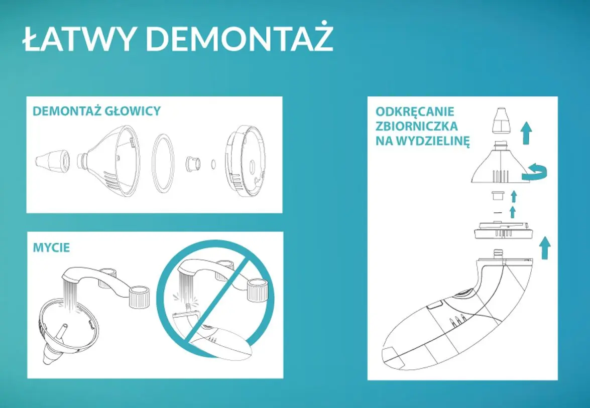 Kompaktowa konstrukcja sprawia, że wszystkie elementy mające kontakt z wydzieliną można szybko rozłożyć, umyć i osuszyć. Zbiorniczek, końcówki i głowicę czyści się zwykłą wodą z detergentem — dzięki temu aspirator zachowuje pełną higienę i jest bezpieczny przy każdym użyciu.