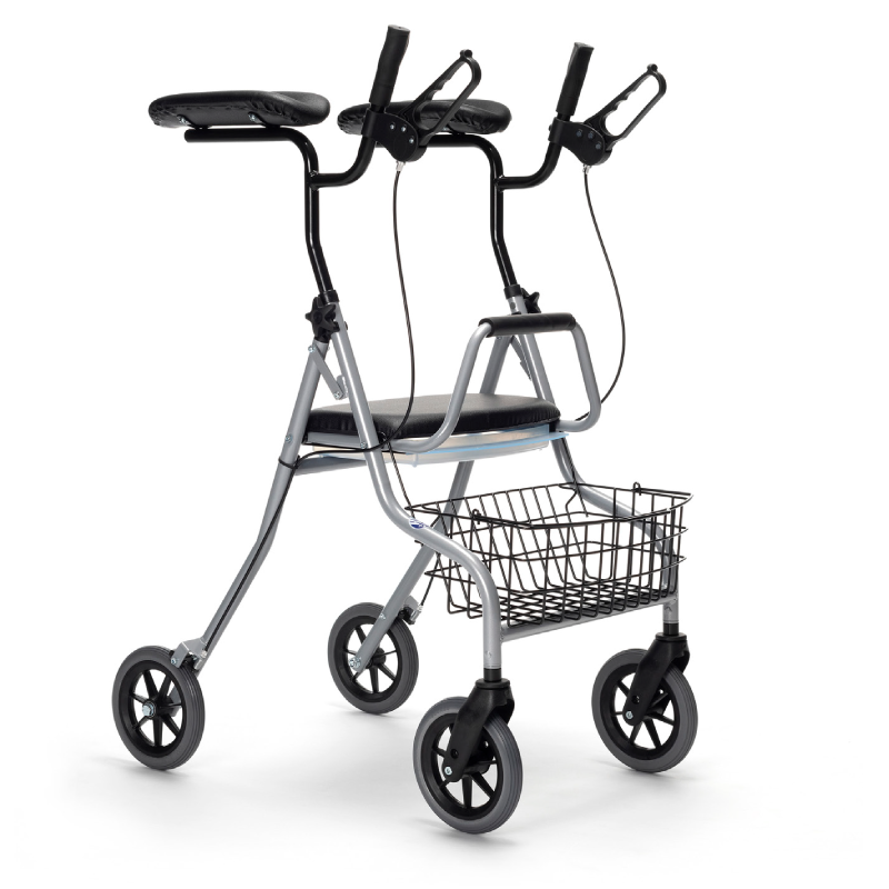 Wyposażony w cztery koła, siedzisko z oparciem, kosz na zakupy oraz ręczne hamulce z blokadą postojową, pozwala na swobodne spacery i odpoczynek w dowolnym momencie. Dzięki specjalnym podpórkom pod przedramiona, zapewnia również wsparcie osobom, które nie mogą obciążać dłoni lub nadgarstków.