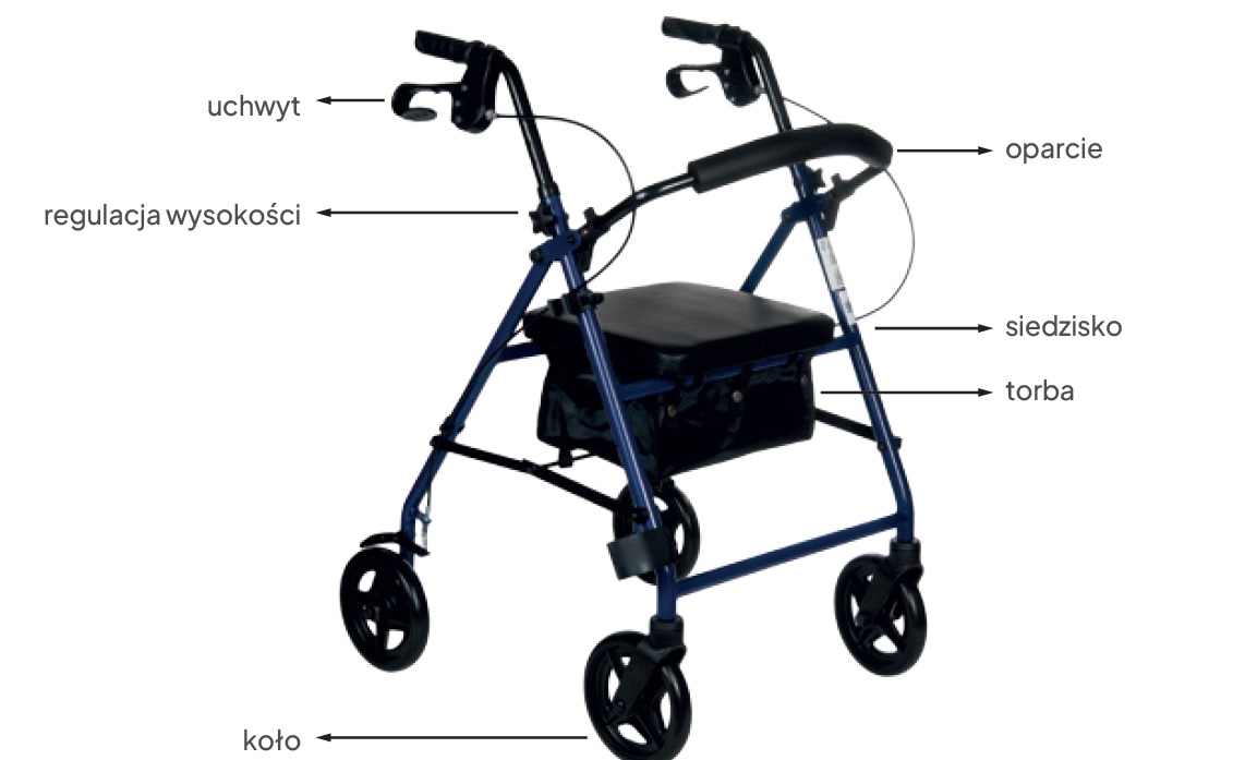 Oparcie zapewnia wygodę podczas siedzenia i stabilizację tułowia. Można je łatwo zdjąć – co ułatwia transport, przechowywanie lub indywidualne dopasowanie chodzika do potrzeb.