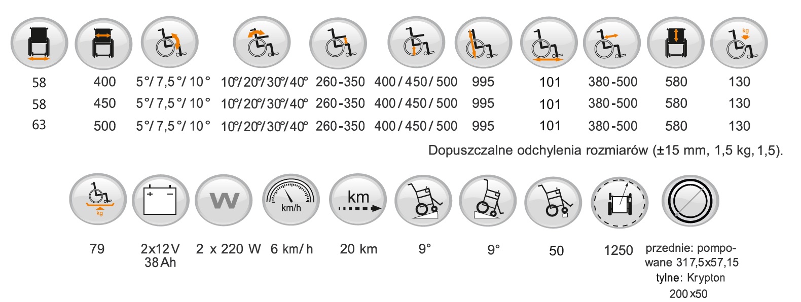 Dopuszczalne tolerancje wymiarowe i wagowe: 15 mm, 1,5 kg i 1,5°.