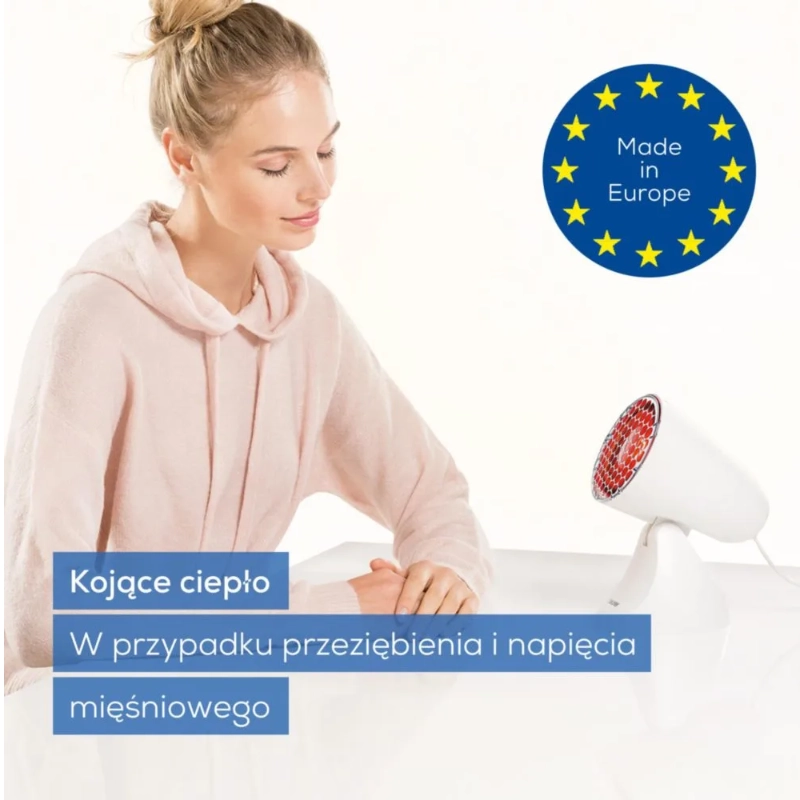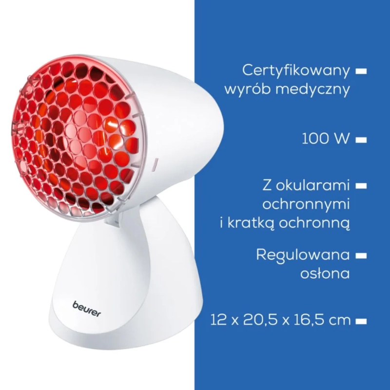 Beurer IL 11 NEW to certyfikowana lampa na podczerwień o mocy 100 W, przeznaczona do łagodzenia dolegliwości związanych z przeziębieniem, napięciem i bólem mięśni. Regulowana osłona z 5-stopniową skalą nachylenia oraz siatka ochronna zapewniają bezpieczne i komfortowe użytkowanie w warunkach domowych.
