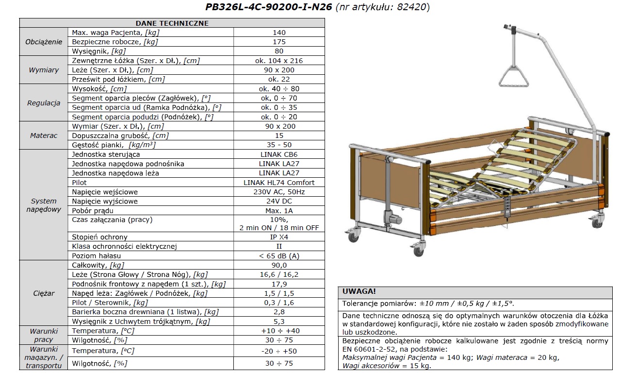 Potwierdzone w karcie technicznej łóżka DanetechnicznePB326 – bezpieczne użytkowanie nawet przy większym obciążeniu (pacjent + materac + akcesoria).