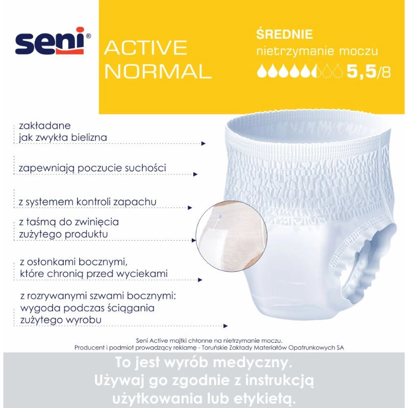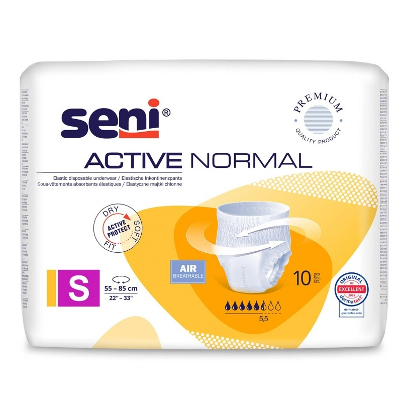 Seni Active Normal to oddychające, jednorazowe majtki chłonne dla kobiet i mężczyzn ze średnim nietrzymaniem moczu. Zakładane jak klasyczna bielizna, zapewniają suchość, dyskrecję i wygodę dzięki systemowi Extra Dry System (EDS), technologii Odour Stop i elastycznym, przyjaznym dla skóry materiałom. Idealne dla osób aktywnych, ceniących komfort i pewność w każdej sytuacji.