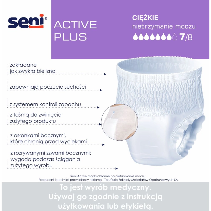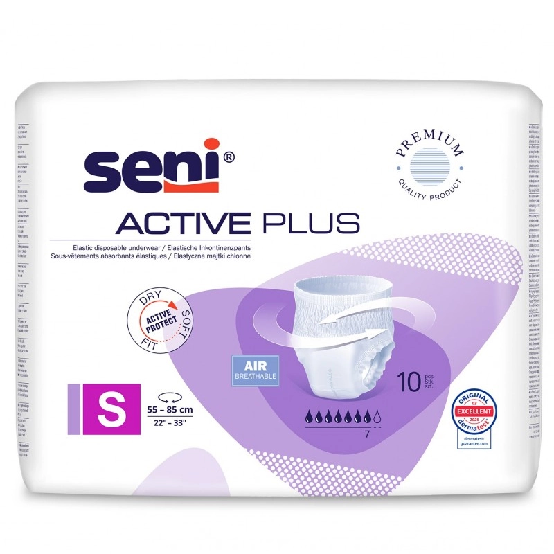 Seni Active Plus to oddychające majtki chłonne dla kobiet i mężczyzn z umiarkowanym i ciężkim nietrzymaniem moczu. Zakładane jak klasyczna bielizna, zapewniają suchość, świeżość i wygodę dzięki technologii Extra Dry System (EDS), Odour Stop i elastycznej konstrukcji. Idealne dla osób aktywnych, które oczekują najwyższego poziomu ochrony i komfortu.
