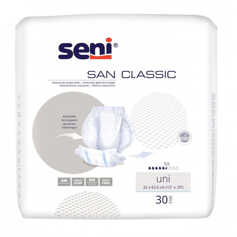 Seni San Classic Uni to oddychające pieluchy anatomiczne przeznaczone dla kobiet i mężczyzn z umiarkowanym lub ciężkim nietrzymaniem moczu, a także dla osób z inkontynencją kałową.