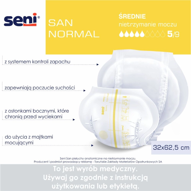 Seni San Normal to oddychające pieluchy anatomiczne przeznaczone dla kobiet i mężczyzn z nietrzymaniem moczu lub kału o średnim stopniu nasilenia. Stosowane razem z majtami mocującymi Seni Fix, zapewniają dyskrecję, wygodę i pełną ochronę przed przeciekami.