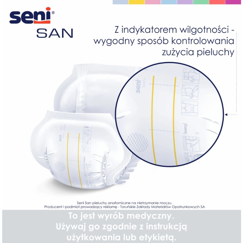 Seni San Uni to oddychające pieluchy anatomiczne dla kobiet i mężczyzn z nietrzymaniem moczu lub kału. Dzięki wysokiej chłonności, systemowi EDS i funkcji Odour Stop zapewniają suchość, świeżość i ochronę skóry. Idealne do stosowania z majtkami Seni Fix – dla osób aktywnych, leżących i wymagających opieki.
