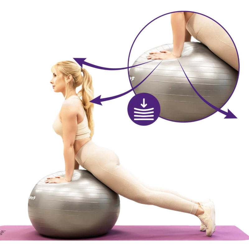 - Regulowana twardość – dopompuj lub upuść powietrze, aby dopasować piłkę do ćwiczenia i swojej wagi.
