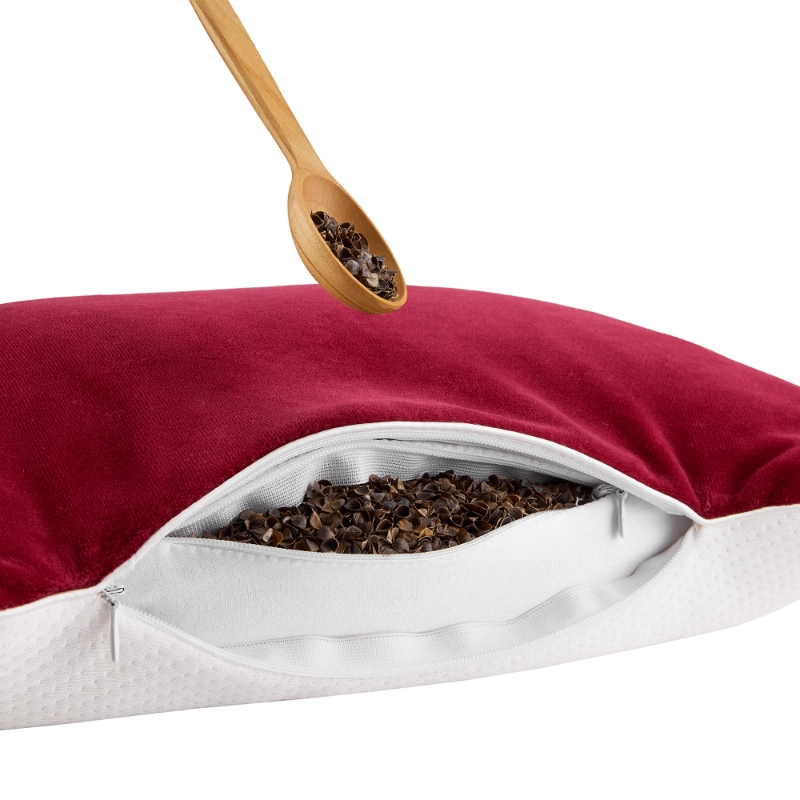 To bardzo proste. Zdejmij zewnętrzny pokrowiec bambusowo-welurowy. Wewnętrzna poszewka posiada zamek błyskawiczny. Rozepnij go i odsyp odpowiednią ilość łuski gryczanej do pojemnika, aż poduszka osiągnie idealną dla Ciebie grubość i miękkość.
