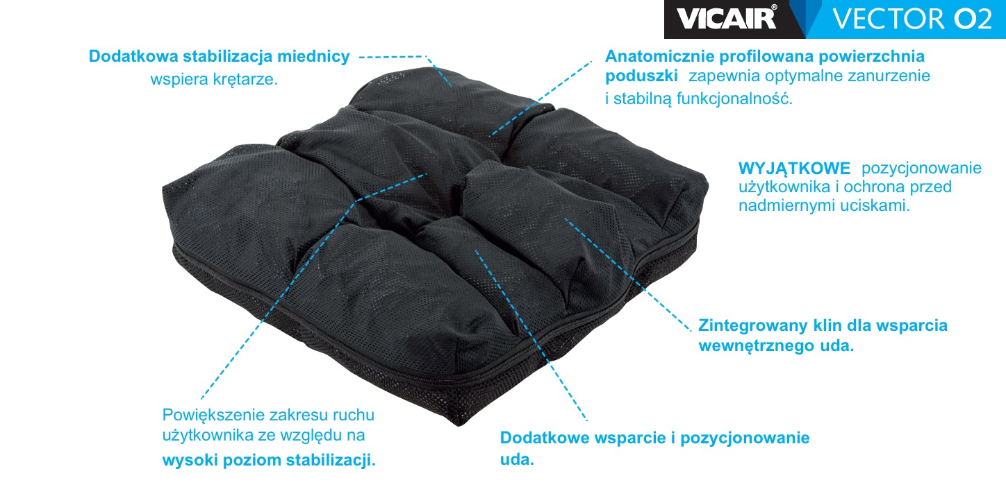 Vicair Vector O2 to innowacyjna poduszka przeciwodleżynowa stworzona w oparciu o technologię SmartCells™. Zapewnia wyjątkową ochronę skóry, stabilizację miednicy i komfort siedzenia, jednocześnie ułatwiając utrzymanie higieny dzięki możliwości prania w pralce w całości.