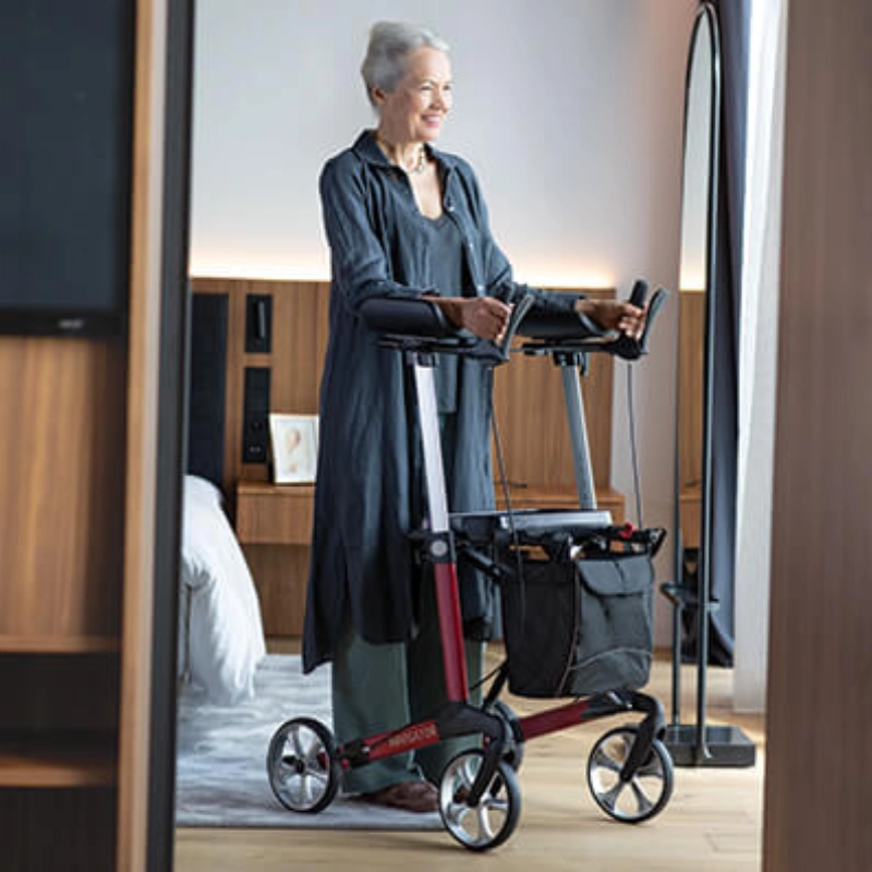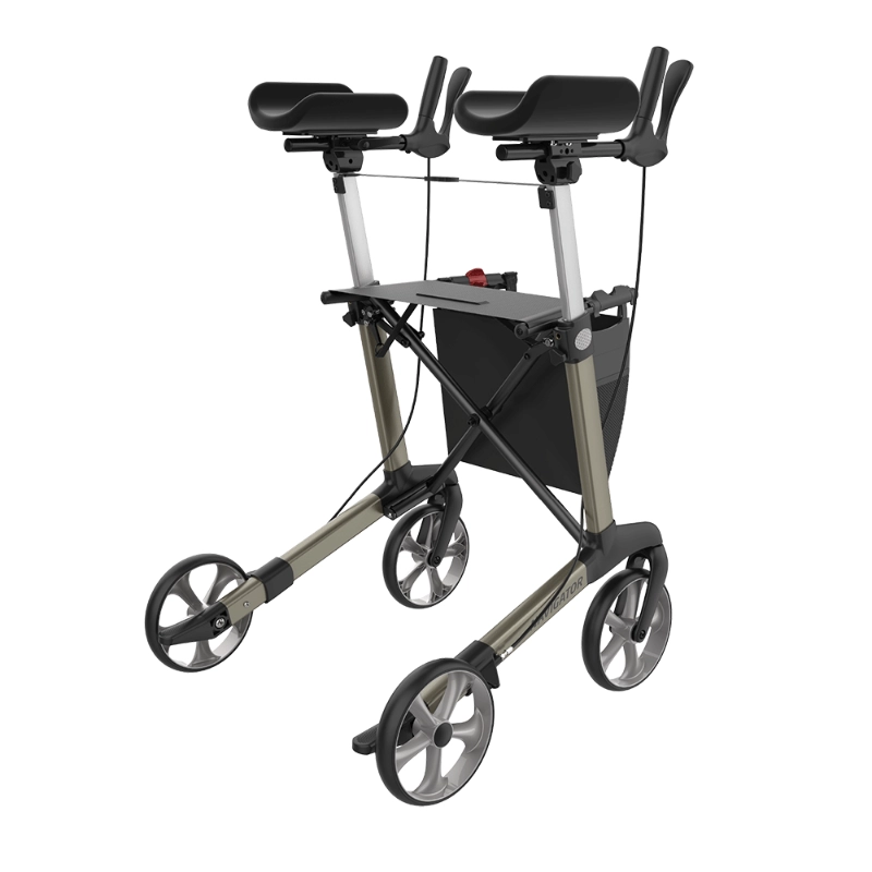 Przydatna wskazówka! Aby prawidłowo i wygodnie użytkować rolator, uchwyty należy ustawić na wysokości nadgarstków. Podczas prowadzenia trzymaj je przy lekko zgiętych ramionach, stojąc prosto między tylnymi kołami urządzenia.