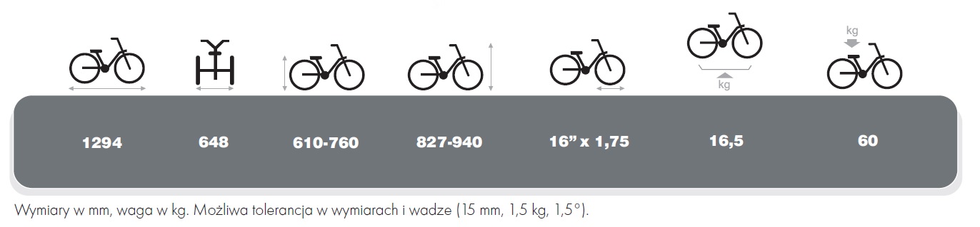 Pomiary w mm, waga w kg – Dopuszczalne odchylenia rozmiarów (±15 mm, 1,5 kg).