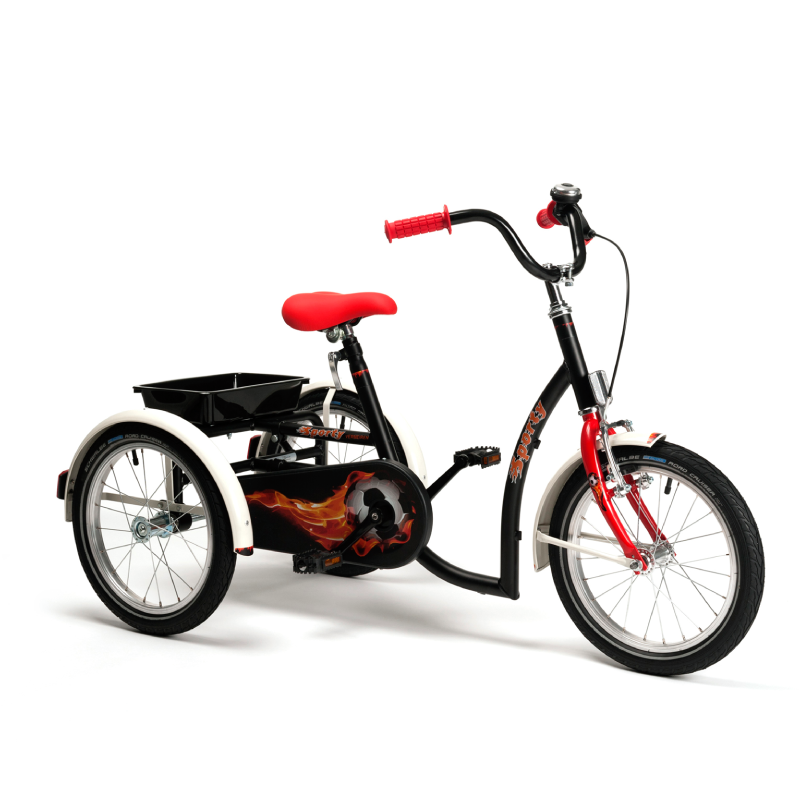 Rowerek Vermeiren 2215 Sporty to wytrzymały, trójkołowy rowerek przeznaczony dla dzieci w wieku ok. 8–13 lat. Intensywny design w czerni z czerwonymi płomieniami przyciąga uwagę młodych użytkowników, a funkcjonalne rozwiązania wspierają zdrowie i samodzielność.