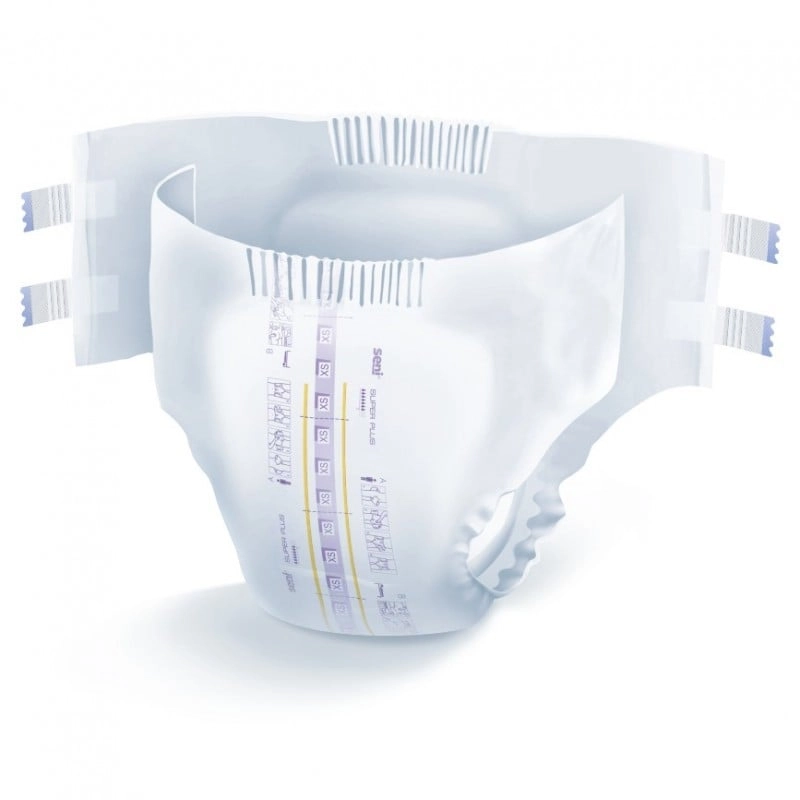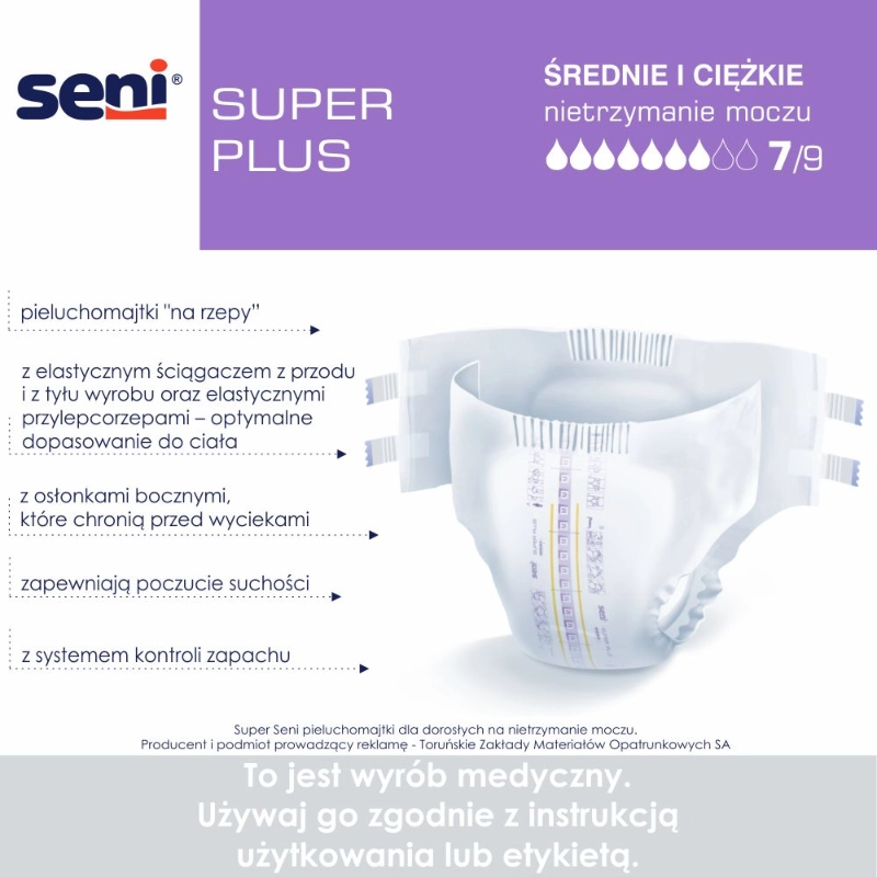 Seni Super Plus to oddychające pieluchomajtki dla dorosłych, zapinane na rzepy, przeznaczone dla osób z ciężkim nietrzymaniem moczu i inkontynencją kałową.