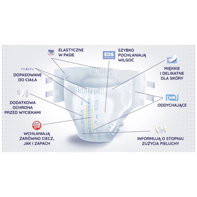 Dzięki zastosowaniu nowoczesnych technologii pieluchomajtki gwarantują wysokie poczucie suchości, pełną ochronę przed przeciekami i maksymalny komfort skóry, nawet przy długotrwałym użytkowaniu