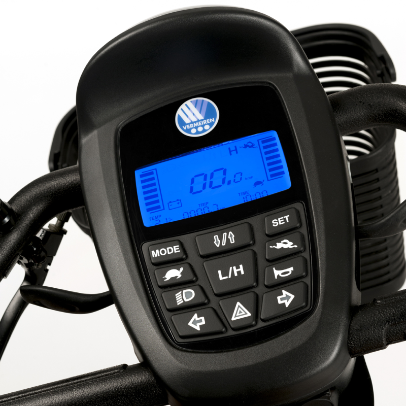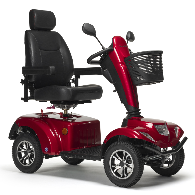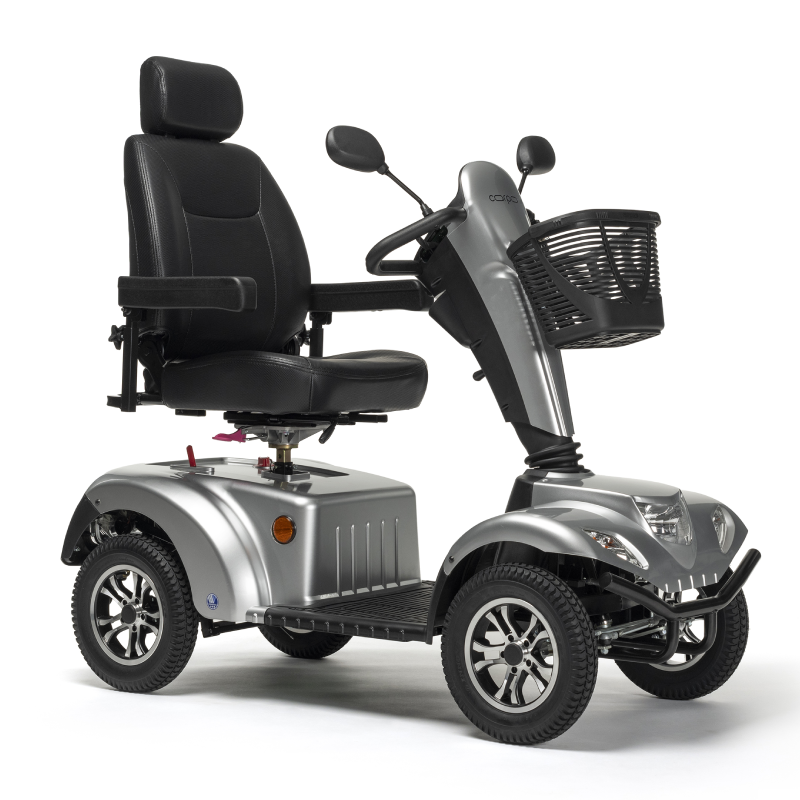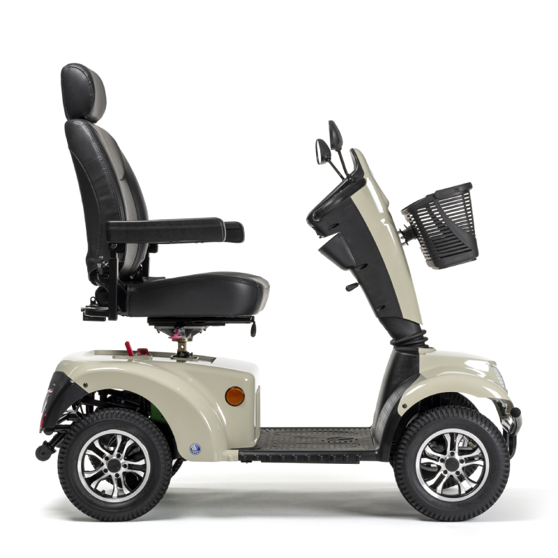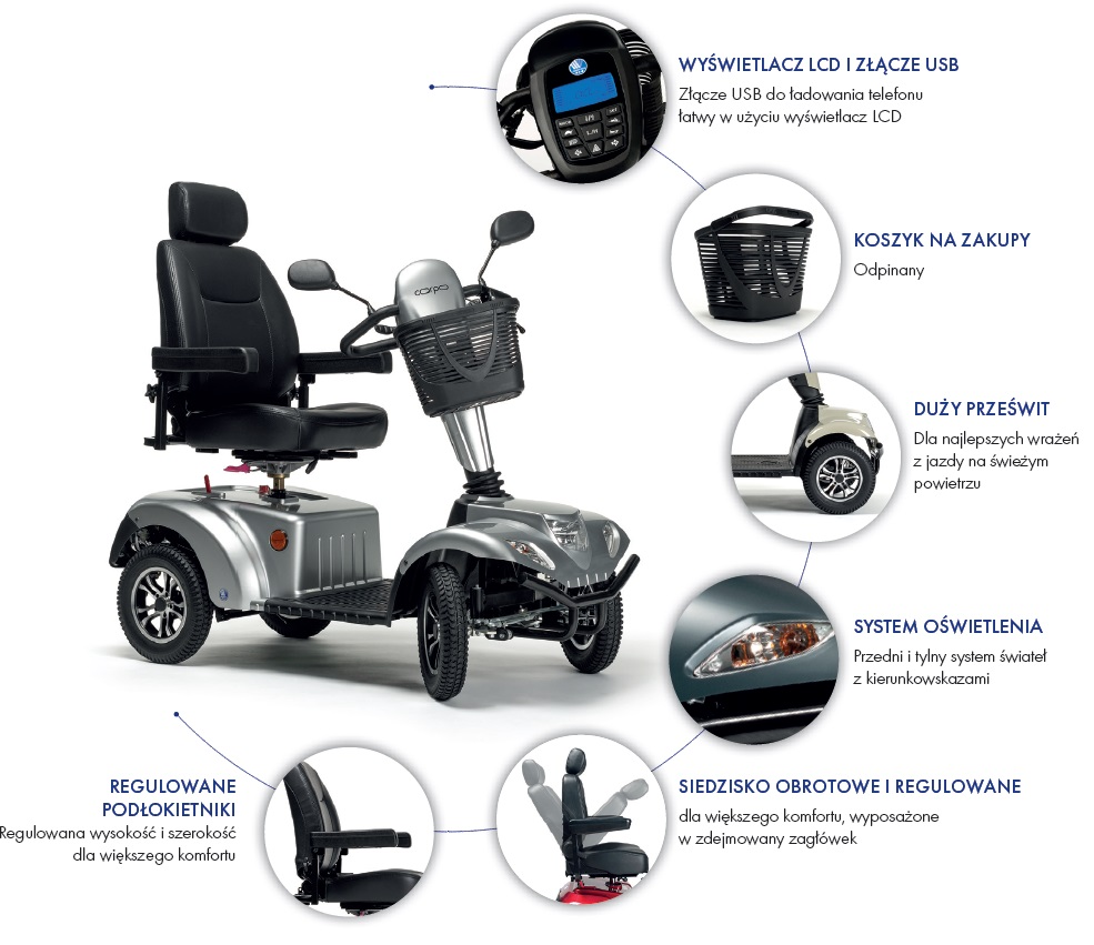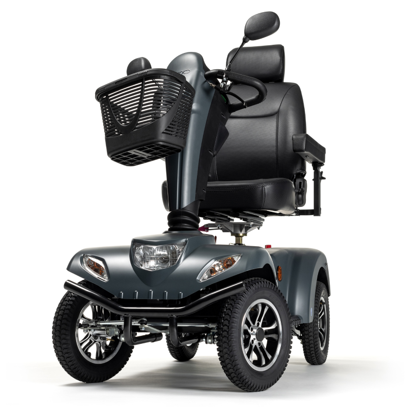 Skuter został zaprojektowany z myślą o maksymalnej wygodzie – obracany i przesuwany fotel, nachylana kolumna kierownicza, odchylane podłokietniki oraz szerokie koła gwarantują łatwe manewrowanie i stabilną jazdę także po nierównościach. Dodatkowe elementy, takie jak koszyk, kółka przeciw-wywrotne, solidny zderzak czy lusterka wsteczne, podnoszą bezpieczeństwo i funkcjonalność.