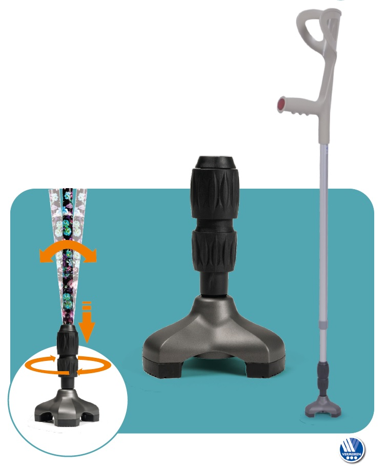 Trip-Tip to nowoczesna stopka zamieniająca laskę lub kulę w stabilny trójnóg. Dzięki dynamicznemu dopasowaniu do podłoża i amortyzacji zwiększa bezpieczeństwo oraz komfort chodzenia. Pasuje do lasek i kul o średnicy 16 mm i 19 mm.