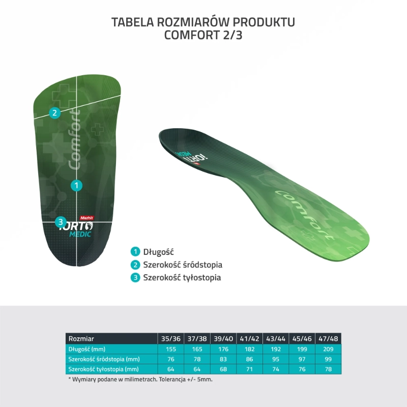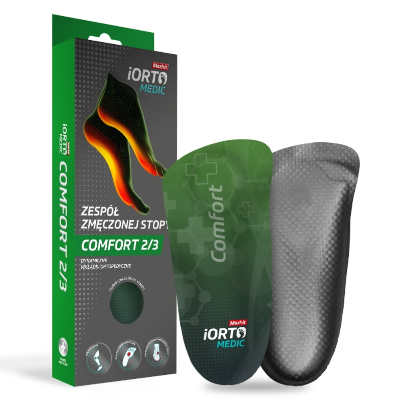 Wkładki iORTO MEDIC Comfort 2/3 (model IO76) to skrócona wersja popularnego modelu Comfort, zachowująca wszystkie jego właściwości terapeutyczne przy zmniejszonym rozmiarze. Konstrukcja o długości 2/3 (sięgająca do głów kości śródstopia, pozostawiając palce wolne) sprawia, że jest to idealne rozwiązanie do obuwia dopasowanego, z wąskimi czubkami lub odkrytymi palcami.
