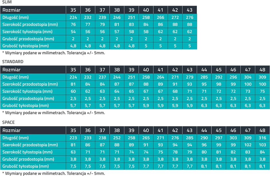 - SPACE (IO92): Do obuwia szerokiego, sportowego, trekkingowego lub roboczego.