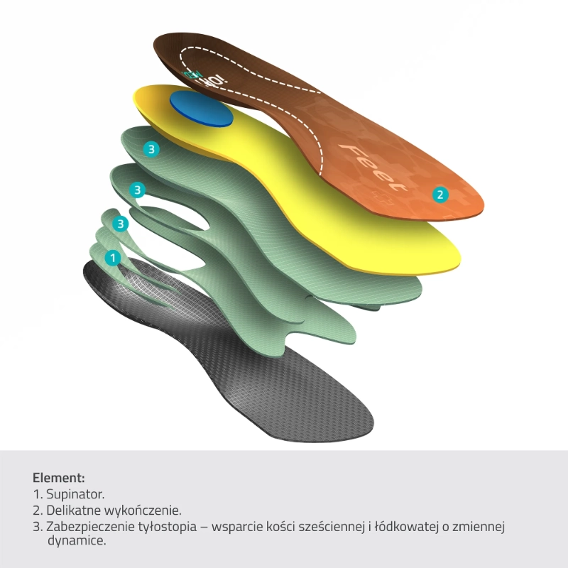 Specjalistyczne wkładki ortopedyczne o długości 2/3 (podpierające tyłostopie i śródstopie). Dedykowane osobom z koślawością pięt, płaskostopiem podłużnym oraz problemami ze ścięgnem Achillesa. Posiadają wbudowany supinator korygujący ustawienie pięty o 5mm oraz głębokie korytkowe stabilizowanie. Idealne do dopasowanych butów.