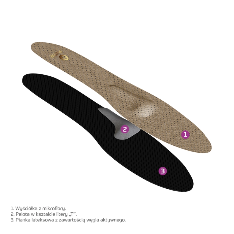 Większość wkładek na rynku posiada standardową pelotę w kształcie kropli. Model VENUS wyróżnia się zastosowaniem Peloty Metatarsalnej typu „T”. Jest to rozwiązanie bardziej zaawansowane medycznie: