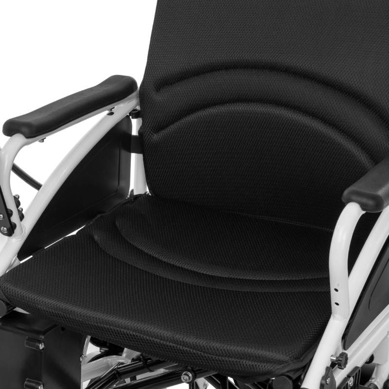 Projektanci postawili na komfort pacjenta, oferując wygodne siedzisko o szerokości 45 cm, regulowane podnóżki oraz miękkie podłokietniki, które zapewniają stabilne podparcie rąk podczas jazdy.