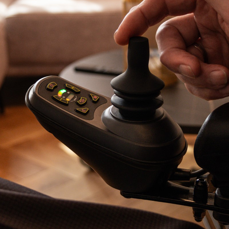 Wózek został wyposażony w czuły joystick, który umożliwia płynne manewrowanie. Na panelu sterowania użytkownik ma stały podgląd na stan baterii oraz aktualną prędkość.