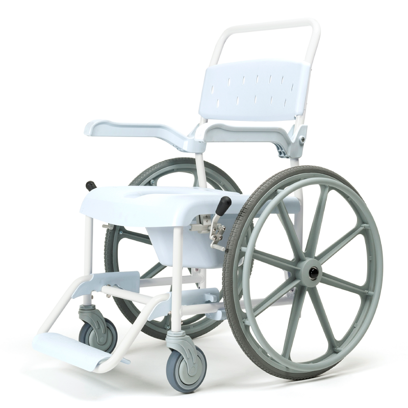 Vermeiren Pluo to ergonomiczny wózek toaletowo-prysznicowy z dużymi kołami 24″, miękkim siedziskiem z PU i pojemnikiem sanitarnym. Przeznaczony do samodzielnego użytkowania w łazience – pod prysznicem lub jako mobilna toaleta.